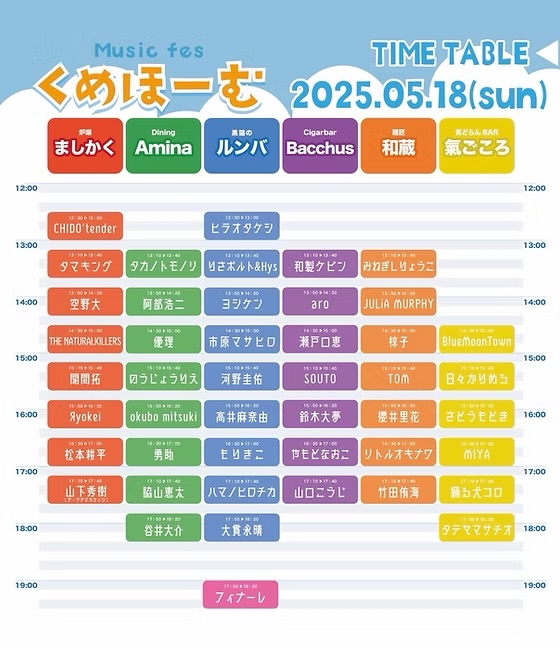 松本耕平 / 鈴木大夢 / タテヤマサチオ / 山口こうじ / 大貫永晴 / 谷井大介 / 阿部浩二 / 日々かりめろ / 高井麻奈由 / さとうもとき / タマキング / SOUTO / CHIDO’tender / THE NATURALKILLERS / 櫻井里花 / のうじょうりえ / 河野圭佑 / もりきこ / 優理 / 和製ケビン / 瀬戸口恵 / TOM / タカノトモノリ / ハマノヒロチカ / 聞間拓 / JULiA MURPHY / Яyokei / ヨシケン / りさボルト&Hys / 村岡由太 / okubo mitsuki / 脇山恵太 / 空野大 / みねぎしりょうこ / 勇助 / BlueMoonTown / 椋子 / aro / 市原マサヒロ / ヒラオタケシ / MIYA / やもとなおこ / リトルオキナワ / 踊る犬コロ / 山下秀樹(ザ・ラヂオカセッツ) / 竹田侑海