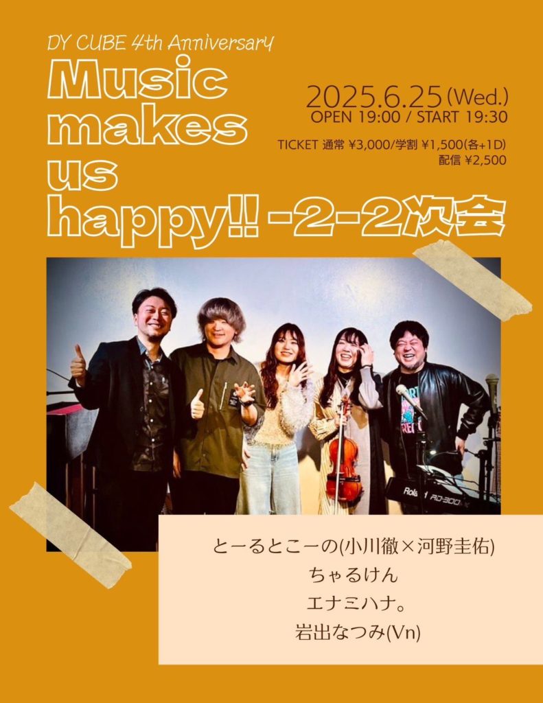 ライブ 2025.06.25(水)関東 『DY CUBE 4th Anniversary 「Music makes us happy!!-2-2次会」』 会場:下北沢DY CUBE OPEN-19:00 / START-19:30 一般¥3,000 / 学割 ¥1,500(各+1d) 配信 ¥2,500 ちゃるけん/とーるとこーの(小川徹 × 河野圭佑)/エナミハナ。/岩出なつみ(Vn) ツイート チケットを予約する