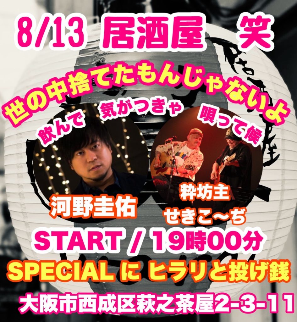 ライブ 2025.08.13(水)近畿 「世の中捨てたもんじゃないよ 飲んで 気がつきゃ 唄って候」 会場:大阪 西成 居酒屋 笑wara 大阪市西成区萩之茶屋2-3-11 START/19時00分 SPECIAL に ヒラリと投げ銭 -出演- 粋坊主 河野圭佑 せきこ〜ぢ ツイート チケットを予約する