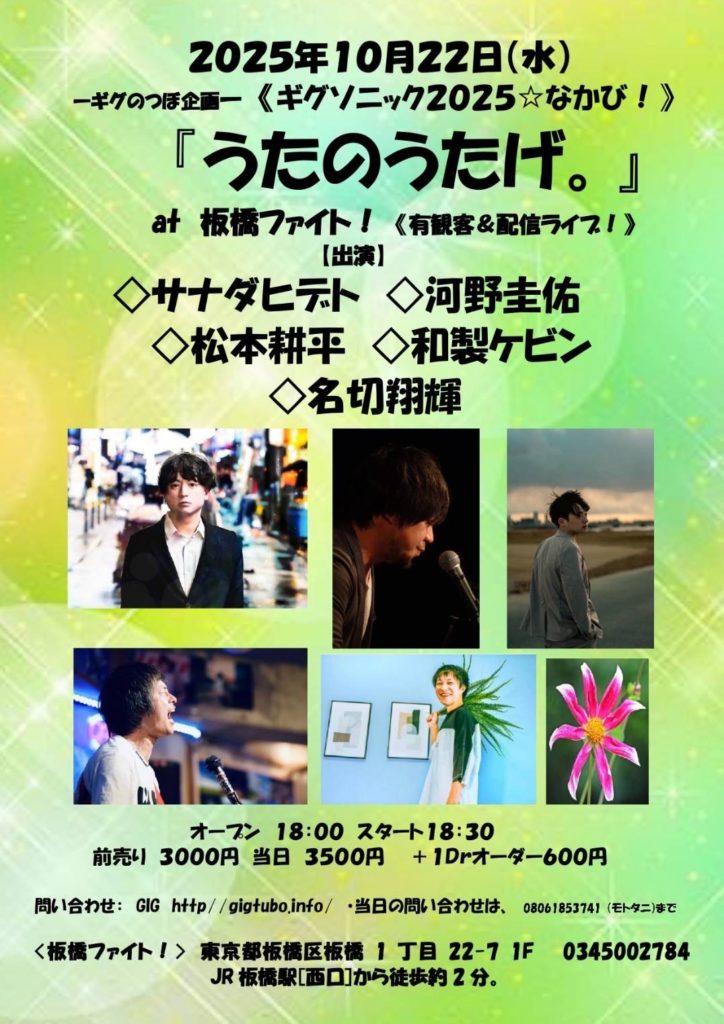 ライブ 2025.10.22(水)関東 ーギグのつぼ企画ーギグソニック2025☆なかび!『うたのうたげ☆』 会場:板橋ファイト! open 18:00 / start 18:30 前売¥3,000 / 当日¥3,500(1drink別) -出演- サナダヒデト 河野圭佑 松本耕平 和製ケビン 名切翔輝 ツイート チケットを予約する