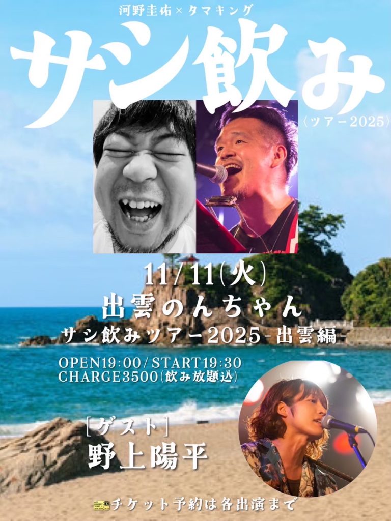 ライブ 2025.11.11(火)中国 河野圭佑×タマキング サシ飲みツアー2025 -出雲編- 会場:島根出雲 のんちゃん 島根県出雲市今市町1307 open 19:00 start 19:30 charge¥3,500(飲み放題込) [ゲスト]野上陽平 ツイート チケットを予約する