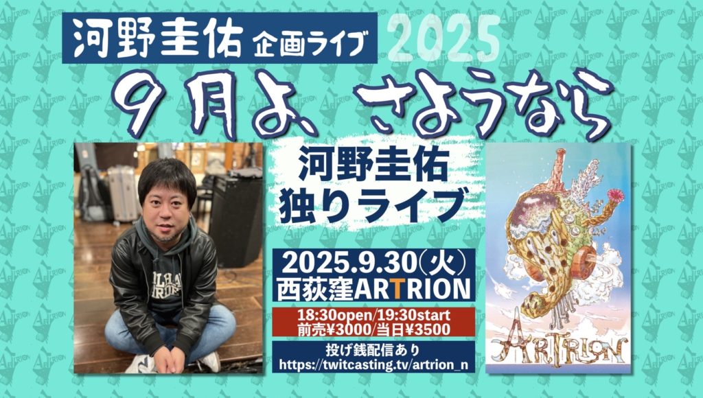 ライブ 2025.09.30(火)関東 河野圭佑企画ライブ 「9月よ、さようなら」 会場:西荻窪 ARTRION open 18:30 /start 19:30 前売¥3,000 /当日3,500(1drink別) 投げ銭配信あり →twitcasting.tv/artrion_n ツイート チケットを予約する