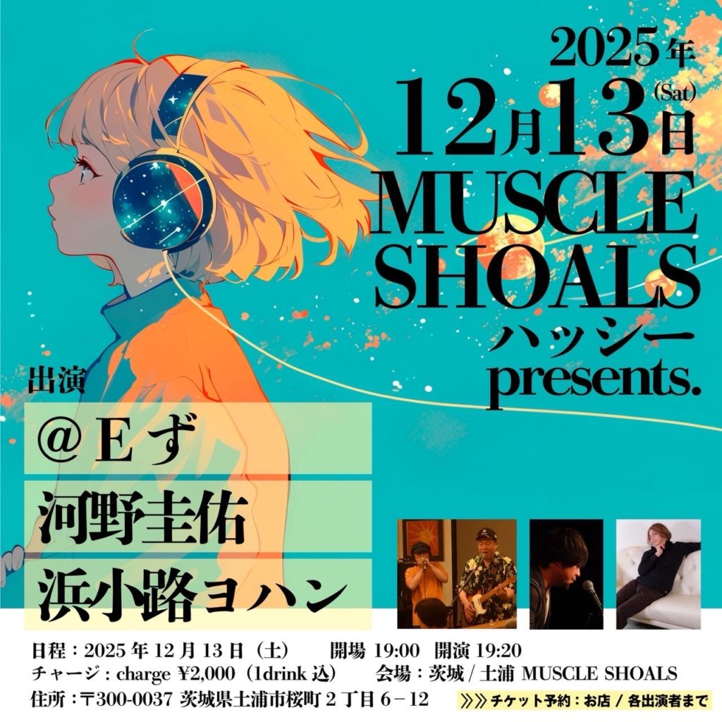 ライブ 2025.12.13(土)関東 ハッシーpresents @MUSCLE SHOALS 会場:茨城土浦 MUSCLE SHOALS 会場: 〒300-0037 茨城県土浦市桜町2丁目6−12 open 19:00 / start 19:20 charge ¥2,000(1drink込) -出演- @Eず 河野圭佑 浜小路ヨハン ツイート チケットを予約する