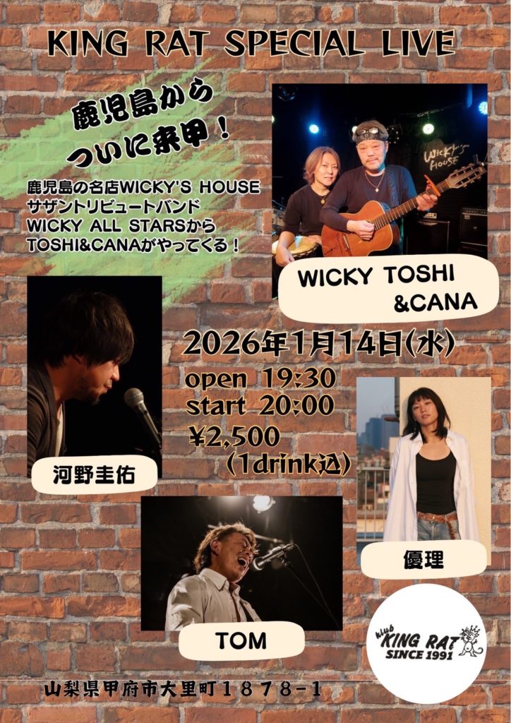 ライブ 2026.01.14(水)関東 WICKYトシ&カナ来甲! 会場:山梨甲府 Klub KingRat open 19:30 / start 20:00 charge¥2,500(1drink込) -出演- WICKY TOSHI&CANA 河野圭佑 TOM 優理 ツイート チケットを予約する