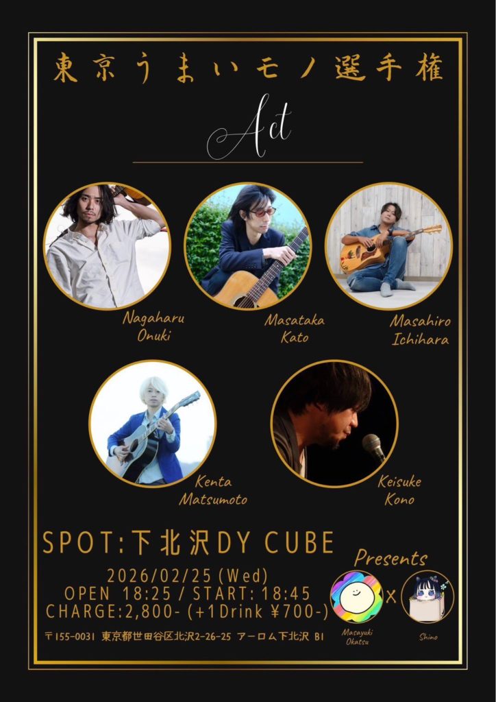 ライブ 2026.02.25(水)関東 『東京うまいモノ選手権』 会場:下北沢DY CUBE open 18:25 / start 18:45 前売¥2,800 (1drink別) -出演- 市原マサヒロ 大貫 永晴 カトウマサタカ 松本 健太 河野 圭佑 ツイート チケットを予約する