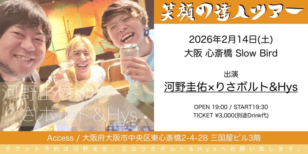 ライブ 2026.02.14(土)近畿 河野圭佑 × りさボルト&Hys 笑顔の達人ツアー2026 大阪編 会場:大阪 心斎橋 SlowBird OPEN 19:00 / START 19:30 TICKET ¥3,000(別途Drink代) ツイート チケットを予約する