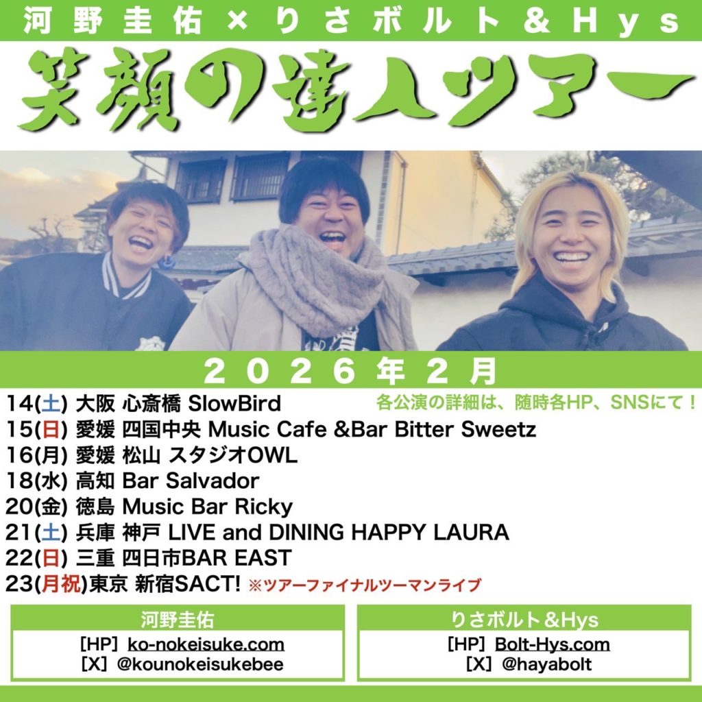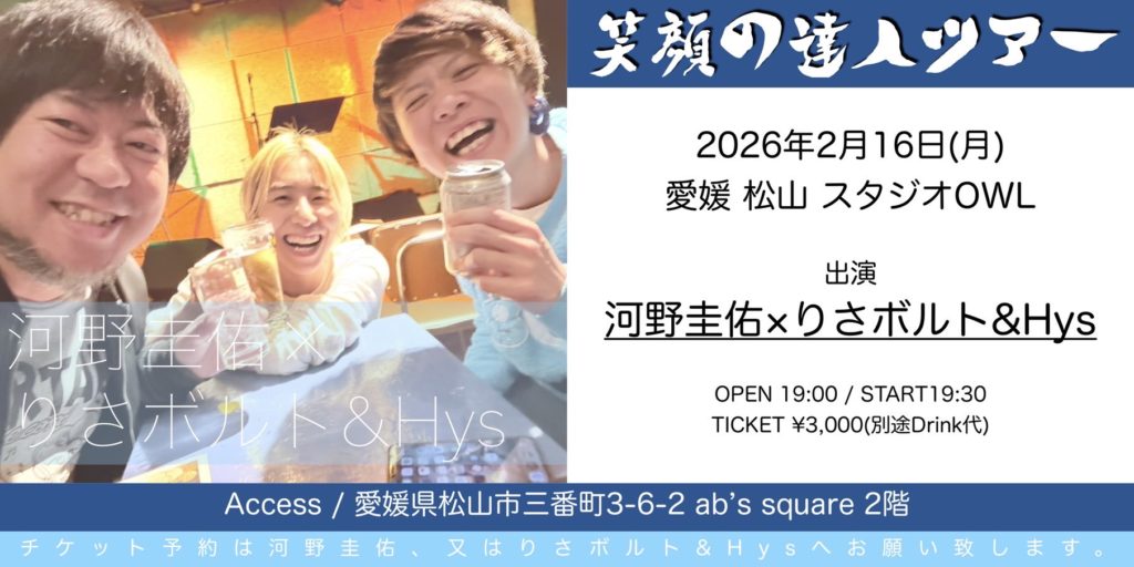 ライブ 2026.02.16(月)四国 河野圭佑 × りさボルト&Hys 笑顔の達人ツアー2026 松山編 会場:愛媛 松山 スタジオOWL OPEN 19:00 / START19:30 TICKET ¥3,000(別途Drink代) ツイート チケットを予約する