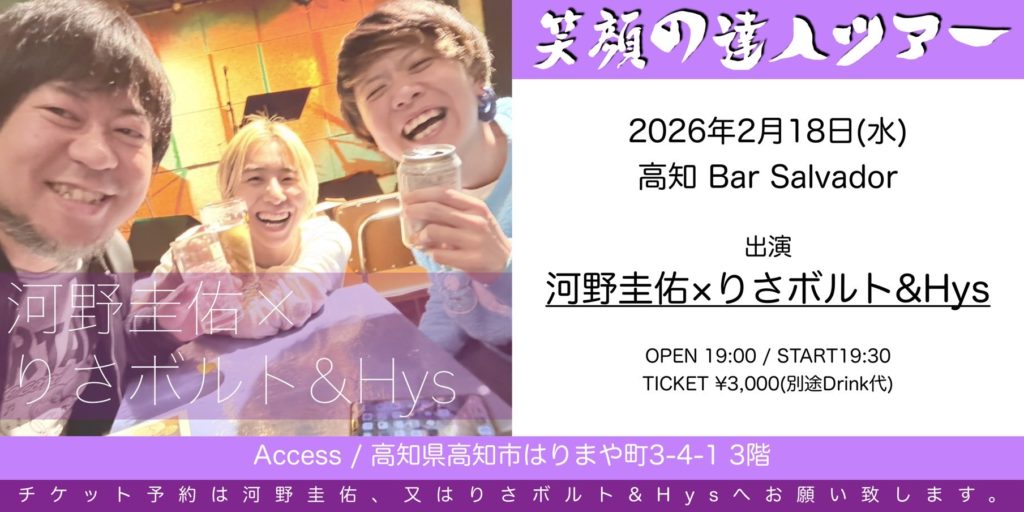 ライブ 2026.02.18(水)四国 河野圭佑 × りさボルト&Hys 笑顔の達人ツアー2026 高知編 会場:高知 Bar Salvador OPEN 19:00 / START19:30 TICKET ¥3,000(別途Drink代) ツイート チケットを予約する