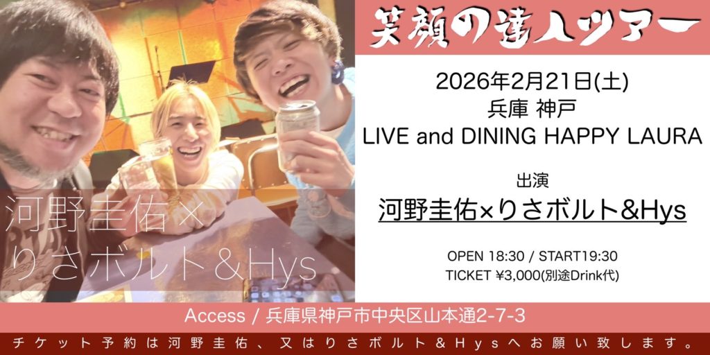 ライブ 2026.02.21(土)近畿 河野圭佑 × りさボルト&Hys 笑顔の達人ツアー2026 神戸編 会場:兵庫 神戸 HAPPY LAURA OPEN 18:30 / START 19:30 TICKET ¥3,000(別途Drink代) ツイート チケットを予約する