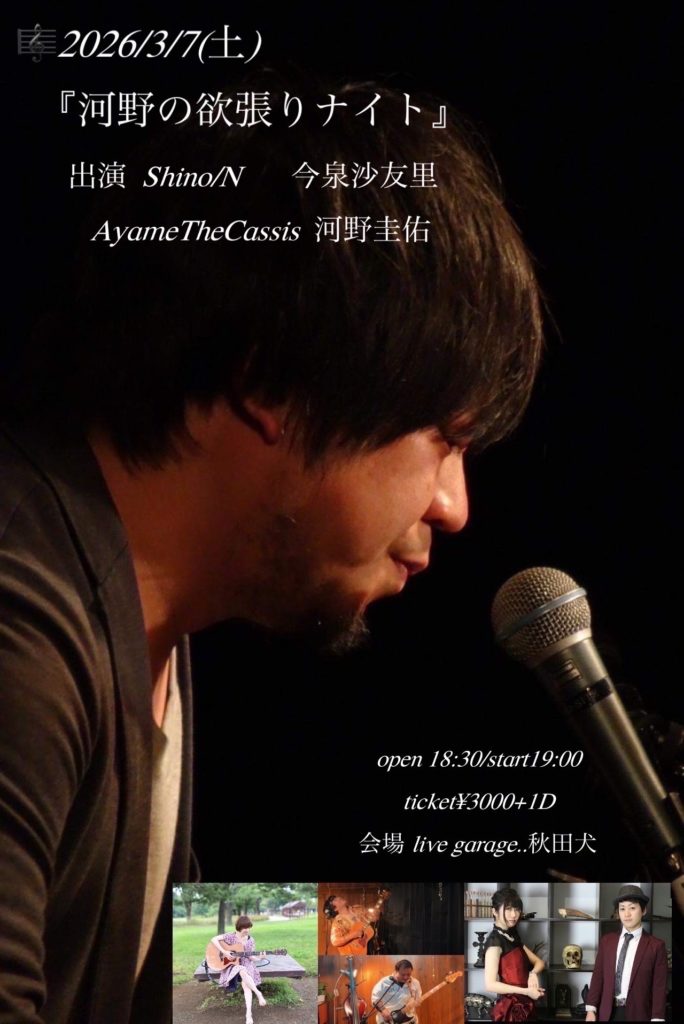ライブ 2026.03.07(土)関東 「河野の欲張りナイト」 会場:live garage 秋田犬 open18:30/start19:00 charge¥3000(+1ドリンク) 出演 Shino/N 今泉沙友里 AyameTheCassis 河野圭佑 ツイート チケットを予約する