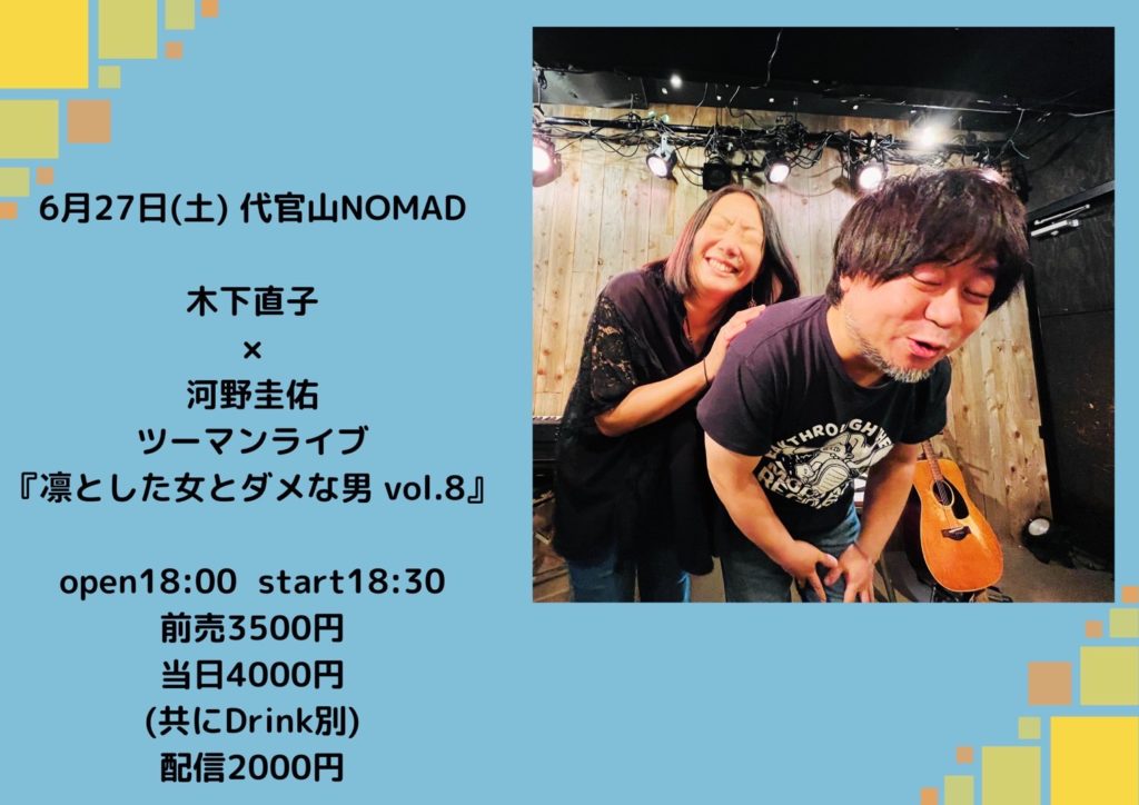 ライブ 2026.06.27(土)関東 木下直子×河野圭佑 凛とした女とダメな男vol.8 会場:代官山 NOMAD open 18:00 / start 18:30 前売¥3,500 / 当日¥4,000(1drink別) 配信¥2,000(URLは後日) 出演: 木下直子/河野圭佑 ツイート チケットを予約する