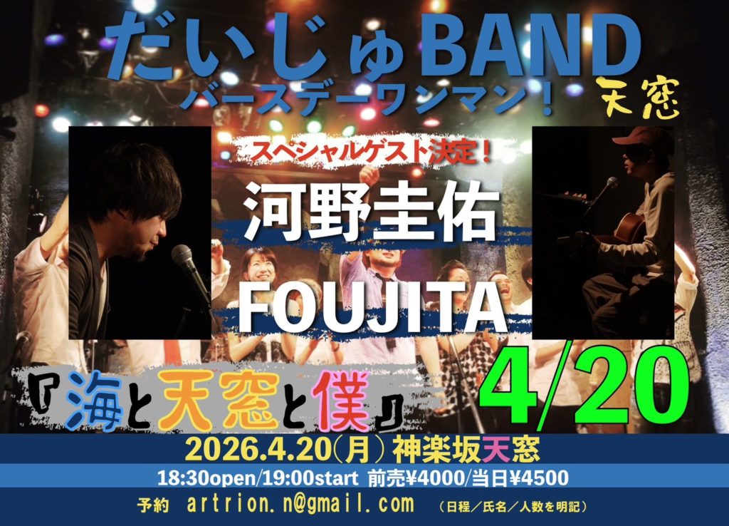 ライブ 2026.04.20(月)関東 だいじゅBANDバースデーワンマン! 【海と天窓と僕】 会場:神楽坂天窓 open 18:30 / start 19:00 前売¥4,000 / 当日¥4,500(1drink別) スペシャルゲスト 河野圭佑 FOUJITA 予約 artrion.n@gmail.com ツイート