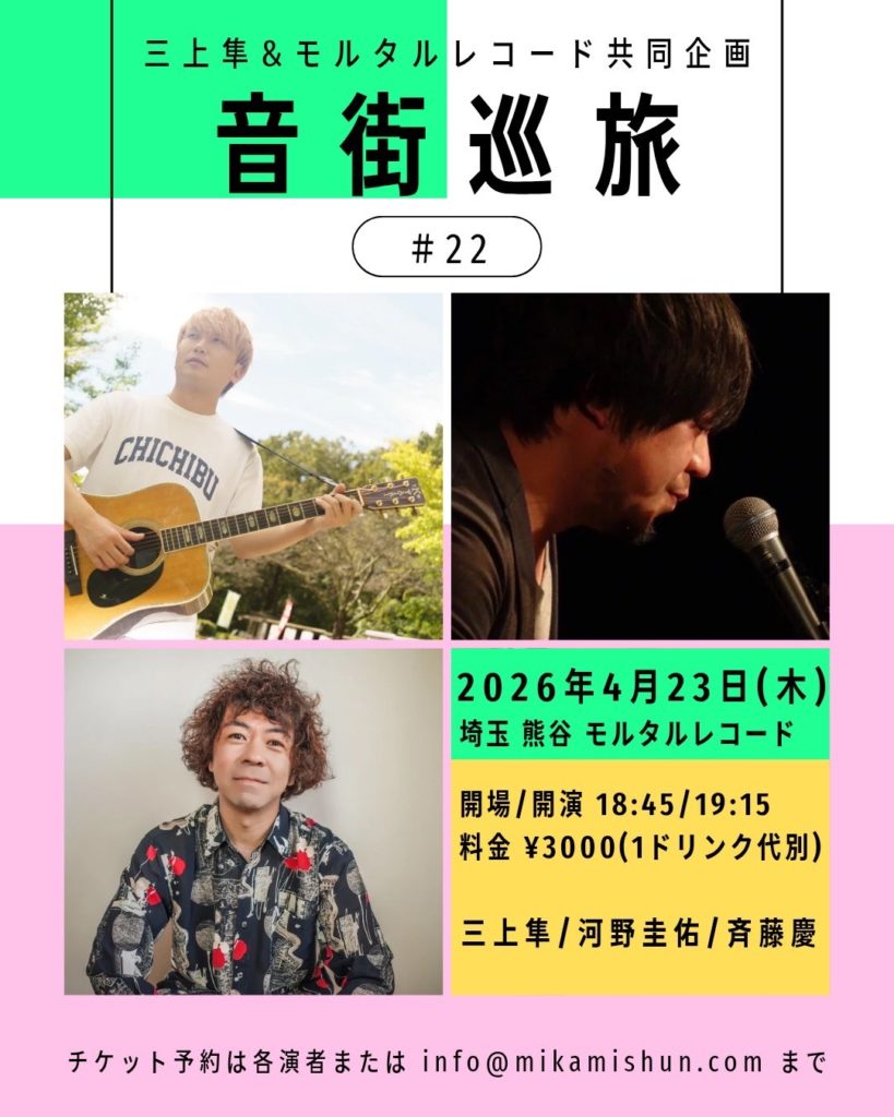 ライブ 2026.04.23(木)関東 三上隼 & モルタルレコード共同企画 「音街巡旅 #22」 会場:埼玉 熊谷モルタルレコード open 18:45 / start 19:15 charge ¥3,000(1drink別) -出演- 三上隼 河野圭佑 斉藤慶 ツイート チケットを予約する